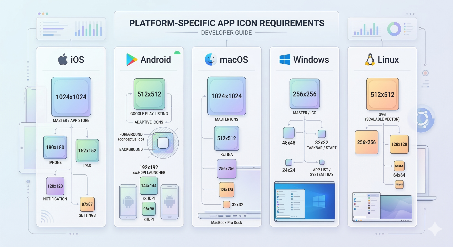 Learn the icon size requirements for iOS, Android, Windows, macOS, and Linux. A complete guide to platform-specific app icons and formats.